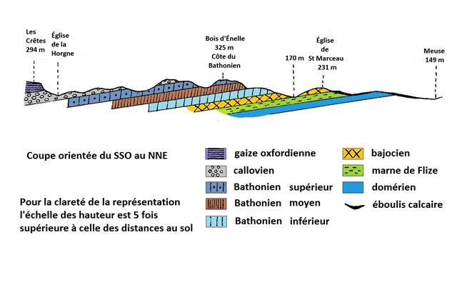 Le réseau hydrographique, renforcé au fur et à mesure de l'approfondissement de la vallée de la Meuse, s'est installé sur le versant Sud-ouest dans les couches du lias et du jurassique composées alternativement de marnes ou d'argile et de calcaires durs ou marneux, affleurant ainsi en bandes parallèles. Aussi, chaque fois que l'érosion a mis à jour une couche plus dure, il s'est constitué un abrupt, une crête dominant une pente plus douce dans les terrains meubles sous-jacents et les éboulis de la couche supérieure.
