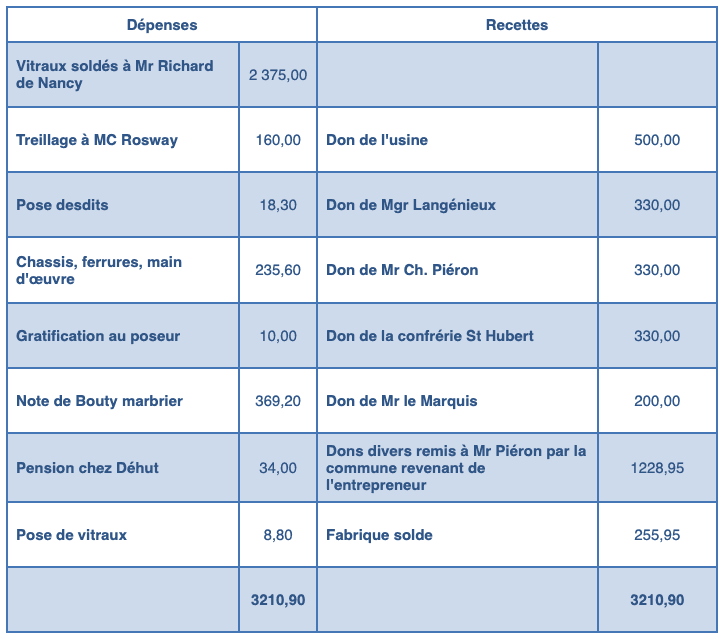 En 1878 la restauration est terminée. Reproduisons par curiosité le livre de comptes de la Fabrique pour cette année-là. Il concerne les vitraux et le dallage en marbre du sanctuaire qui existent toujours.